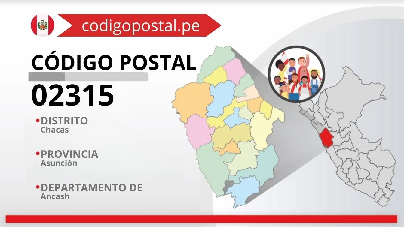 El código postal 02315 corresponde a un total de 57 centros poblados o ciudades, ubicado en la provincia de Asunción del departamento de Ancash.