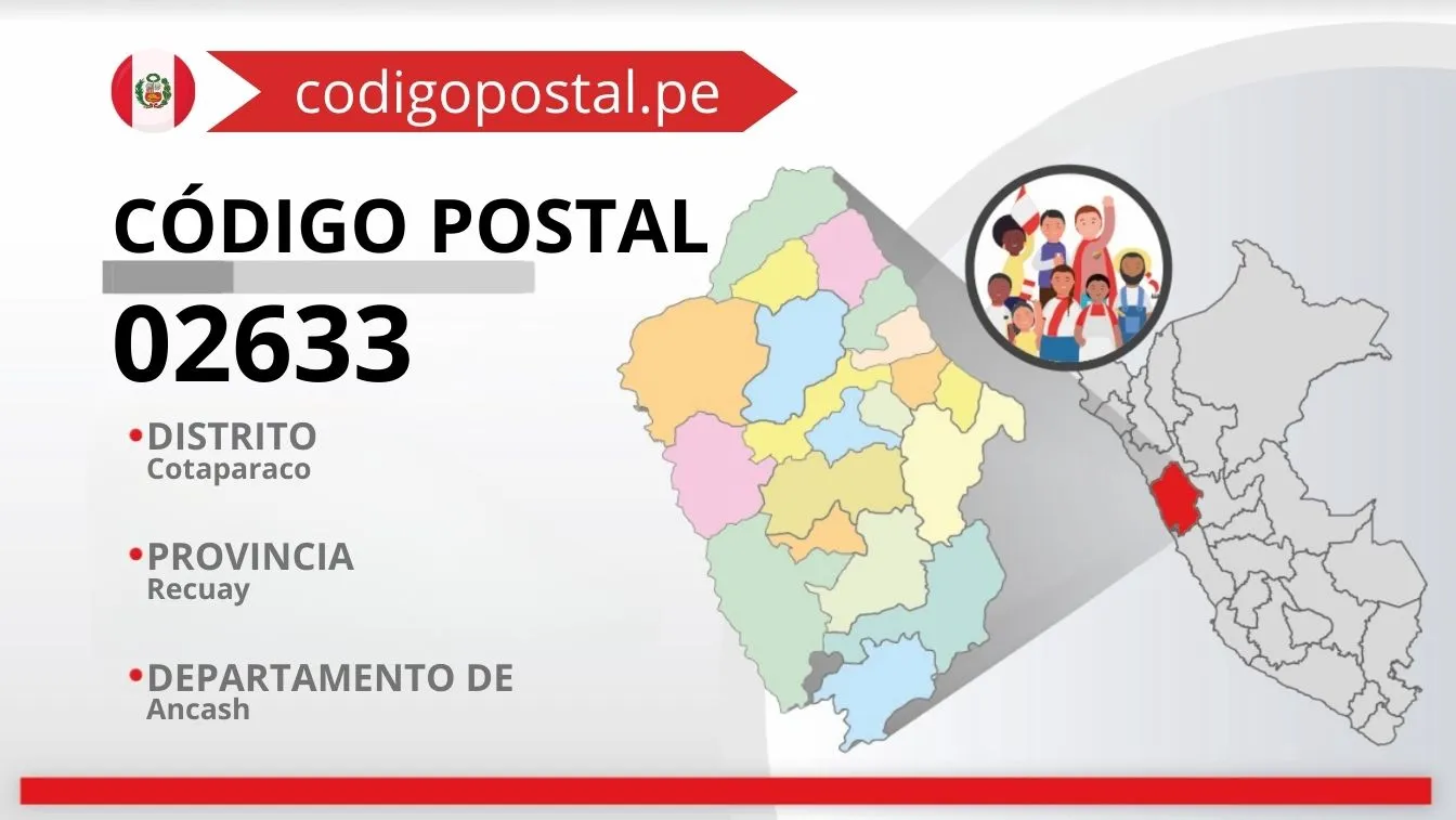 El código postal 02633 corresponde a un total de 53 centros poblados o ciudades, ubicado en la provincia de Recuay del departamento de Ancash.