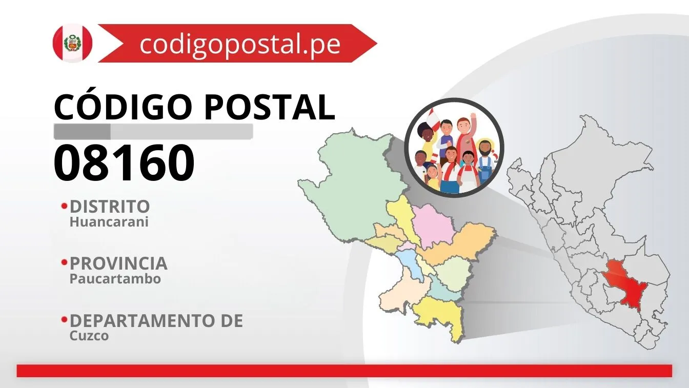 El código postal 08160 corresponde a un total de 34 centros poblados o ciudades, ubicado en la provincia de Paucartambo del departamento de Cuzco.