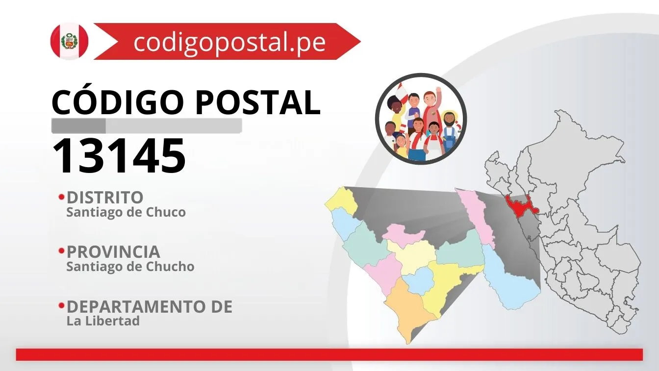 El código postal 13145 corresponde a un total de 65 centros poblados o ciudades, ubicado en la provincia de Santiago de Chucho del departamento de La Libertad.